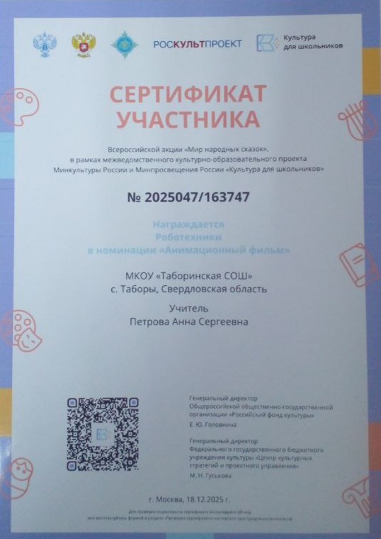 ✅Сертификат участников Всероссийского проекта «Культура для школьников», который проводится при поддержке Министерства культуры и Министерства просвещения. Свой анимационный фильм в жанре русской сказки «Колосок» представило объединение «Робототехника», руководитель Петрова Анна Сергеевна.Поздравляем ребят и коллег, благодарим за активное сотрудничество и отличный пример для наших учеников и партнёров 🎓